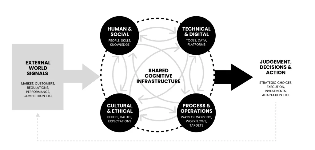 La infraestructura cognitiva es el conjunto de condiciones, comportamientos, acciones, que dan forma a cómo se produce realmente el pensamiento en una organización, no dentro de la cabeza de una persona, sino entre personas que con herramientas, normas, colaboración, co-creación, diseño, exploración, innovación, administración y prácticas de decisión; crear valor para la compañía (luego hablaremos a profundidad sobre valor). En síntesis es el sistema de pensamiento colectivo de una compañía.